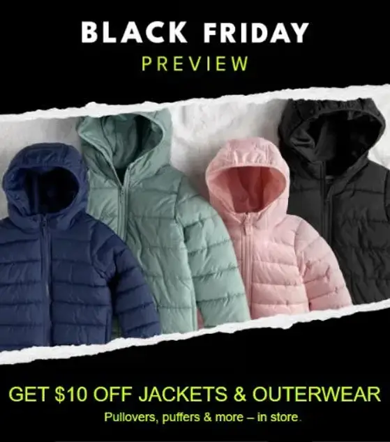 Don't miss out! Shop in store and get $10 off on jackets & outerwear pullovers, puffers & more.